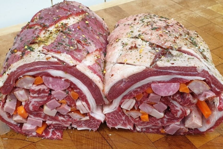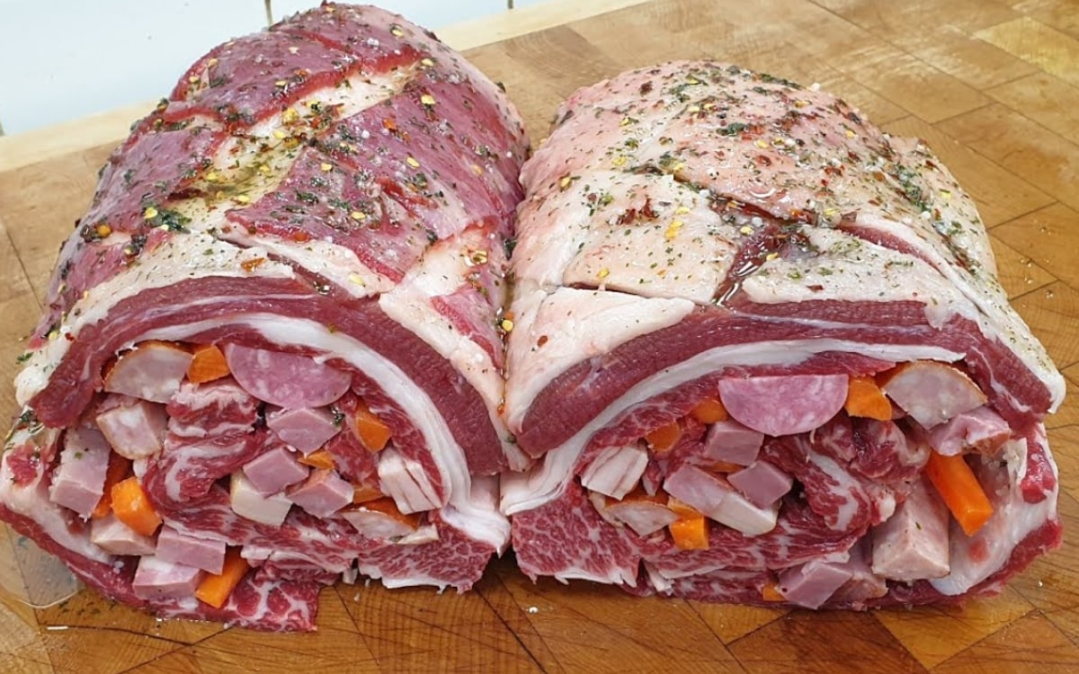 - Enrole cuidadosamente a costela e amarre com barbante culinário, garantindo que o recheio fique bem preso e não escape pelas extremidades.