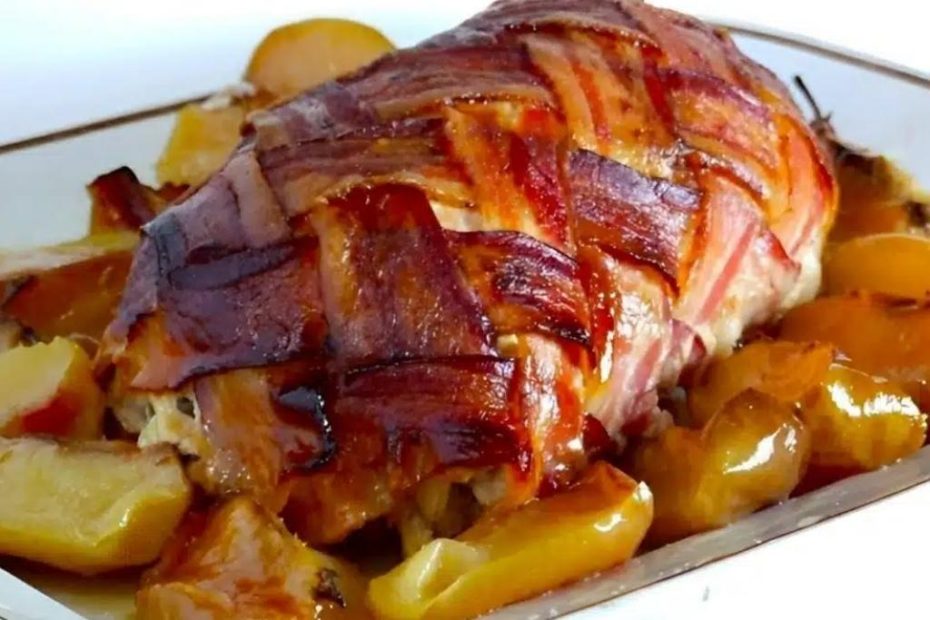 - Depois disso, trance as fatias de bacon em volta da peça e prenda as extremidades do bacon no lombo utilizando palitos de dentes.