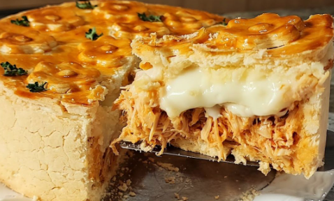 - Abra o restante da massa e cubra o empadão, pressionando as bordas para vedar bem. Use sobras de massa para decorar, se desejar.