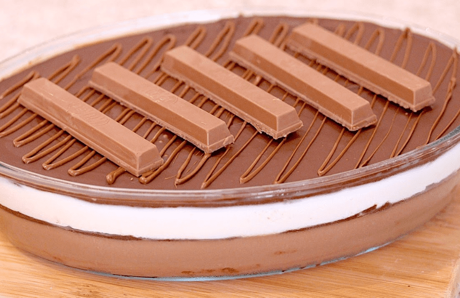 - Decore com linhas de chocolate derretido (50 gramas) e bombons kitkat a gosto.